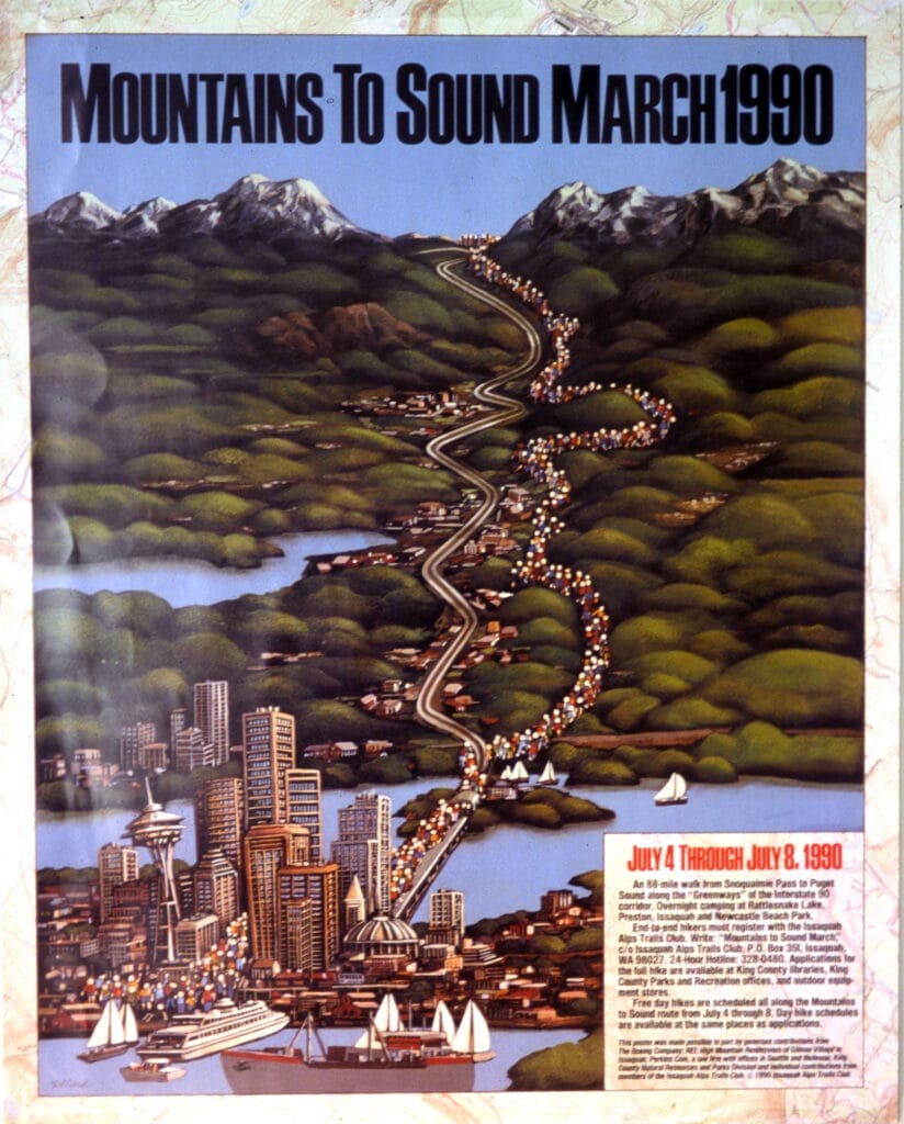 Using Harvey Manning’s “Boots on the Ground” concept, leaders of the Issaquah Alps Trails Club sought to give people a meaningful connection to the outdoors that would inspire them to protect it. The idea for the Mountains to Sound Greenway began taking shape in 1990 when Jack Hornung and the Issaquah Alps Trails Club planned an 88-mile march from Snoqualmie Pass to the Puget Sound to show that the region deserved protection. Hundreds of local residents, led by political leaders and members of the Issaquah Alps Trails Club, staged a march from Snoqualmie Pass to the Seattle waterfront. They were joined by local officials like Gary Locke, who served two terms (1997-2005) as Washington’s Governor, and former Public Commissioner Brian Boyle who decided it was time to make a change on the landscape—before it was too late.Â