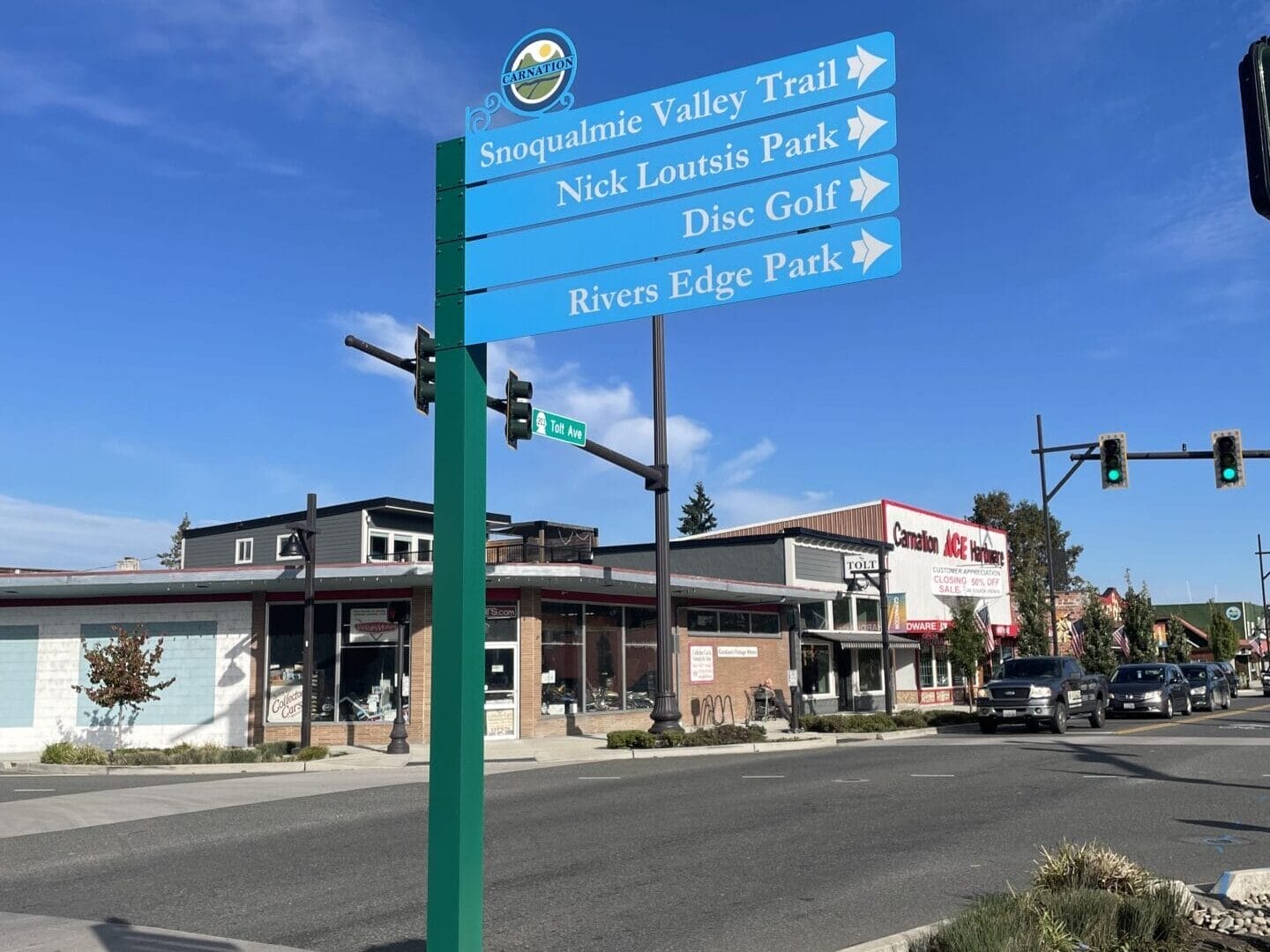 Wayfinding along the Snoqualmie Valley Trail through the City of Carnation and Fall City got a bit easier this summer thanks to 18 new directional and right-of-way signs installed through a partnership with the City of Carnation, Fall City Parks District, King County, and the Greenway Trust. These wayfinding signs are part of a regional initiative to direct visitors safely to and from the Snoqualmie Valley Regional Trail and main streets in the cities and towns, with funding provided by King County.