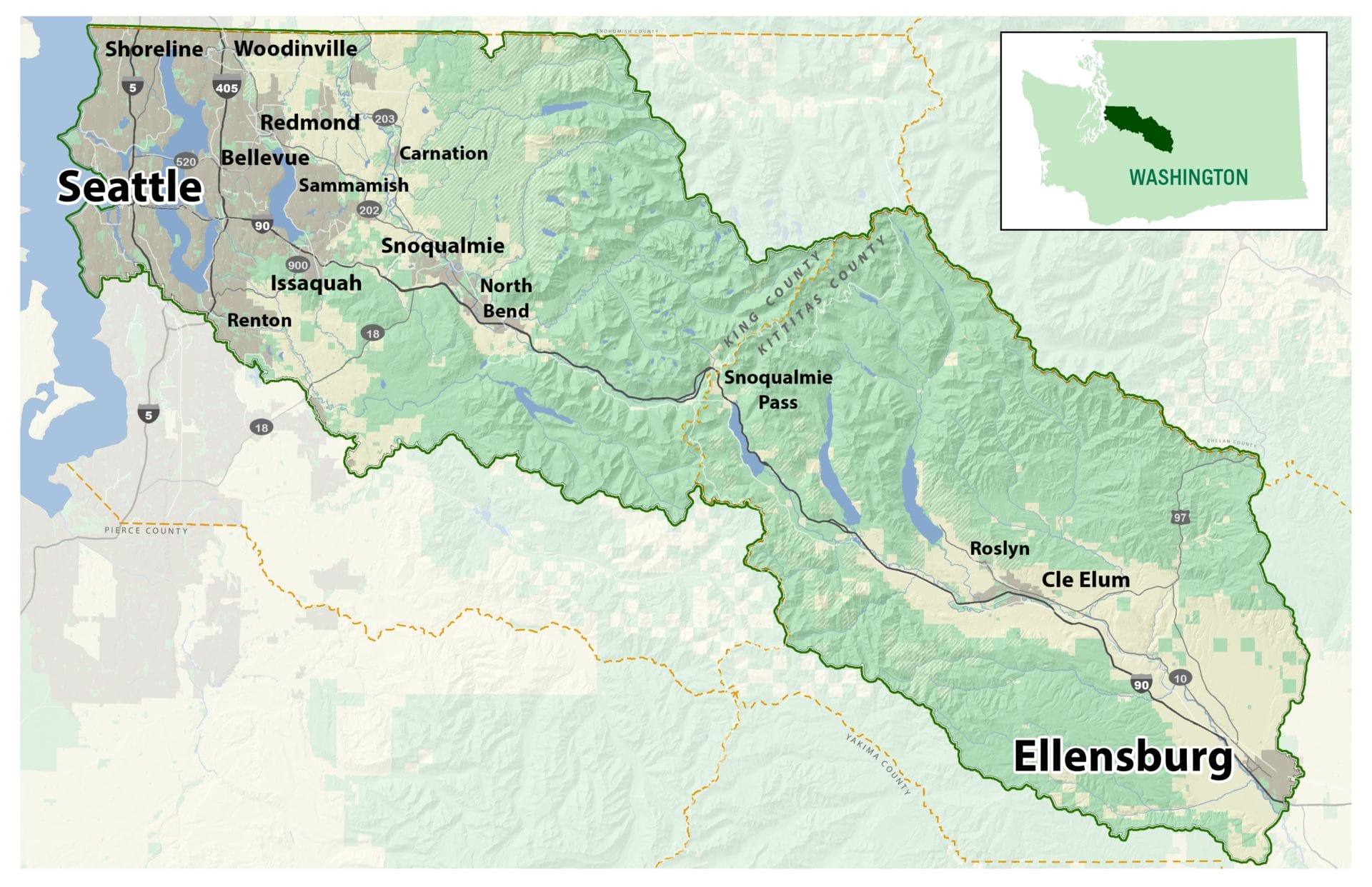 The Mountains to Sound Greenway National Heritage Area spans 1.5 million acres from Seattle to Ellensburg along the I-90 corridor.